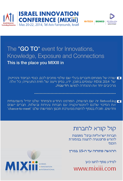 חברות ישראליות ובינלאומיות מוזמנות להגיש פרזנטציות (עד 15.3.14) לכנס הביומד והיי-טק הבינלאומי הענק שיתקיים במרכז הירידים והקונגרסים בת"א ב- 20-22 במאי, ביוזמת IATI – האיגוד הישראלי לתעשיות מתקדמות.